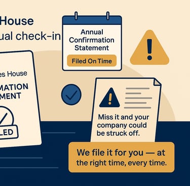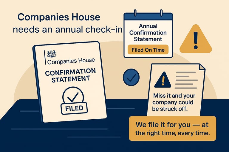 Companies House needs an annual check-in from you — it’s called a confirmation statement. We file this for you, at the right time, every time.