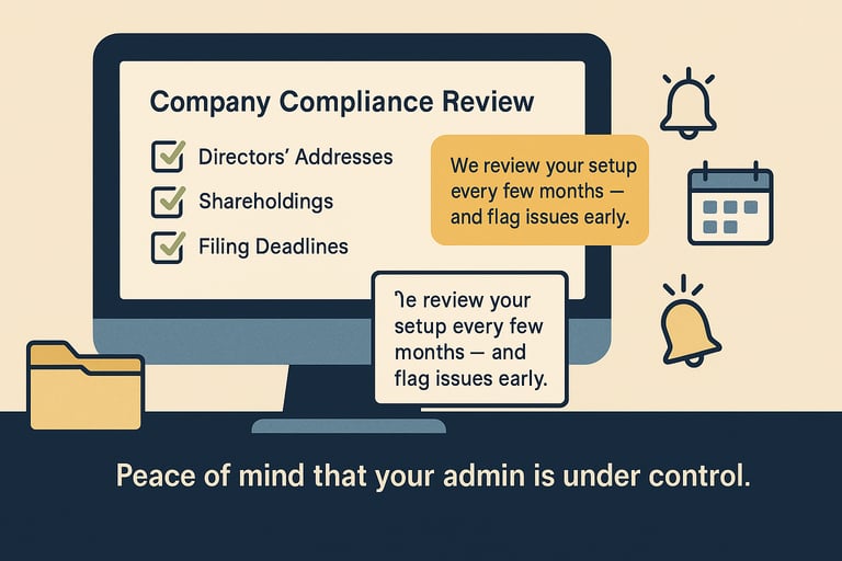 If something needs updating — like directors’ addresses or shareholdings — we’ll flag it before it becomes an issue.