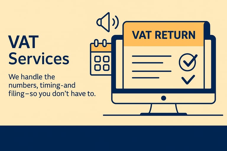If you're VAT-registered, we’ll prepare and file your VAT returns — on time, every time — fully compliant with HMRC’s Making Tax Digital rules.